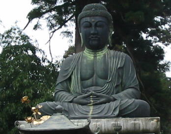 このお寺は、標高432.9mの繖(きぬがさ)山、別名観音寺山の中腹に位置する山寺。駐車場から境内までの石段は不規則に積まれており歩きにくい。数百メートルしか無いはずがもっと長く感じる。参道のモミジはもう終わりかけという感じだったが、その落ち葉が参道の石段にしかれている様はなかなか風情があって良かったですね。そんな雰囲気を楽しみながら無事お寺に到着。この寺には山門はなく、参道を登り切ると右手に鐘楼、奥の方に再建中の本堂までが目に入る。この寺の本堂は、平成5年5月にご本尊の千手千眼観世音菩薩とともに焼失してしまっている。本堂は現在再建中で、また、ご本尊も総白檀で彫像中とのこと。平成16年には落慶、開眼法要の予定とのこと。現在は庫裡を仮本堂として、その中に彫像中のご本尊の雛形として作成された仮本尊に参拝できる。参拝をすませ納経所で朱印を貰っていると、オートバイでご苦労様ですとの一言。服装とか凍えて鼻水をズルズルすすりながら立っている雰囲気で分かるんでしょうね。仮本堂前には西国札所のお砂踏み場があり、その前には濡佛と呼ばれる大佛がある。この濡佛は昭和58年に再建された物で、先代は江戸時代の物だったが第2次世界大戦中に供出されてしまったとのこと。現在、再建中の本堂の前からは蒲生野が一望できるはずだが、今回はあいにくの曇り空で霞がかかってしまい下界の様子はまったく見えなくて残念でした。